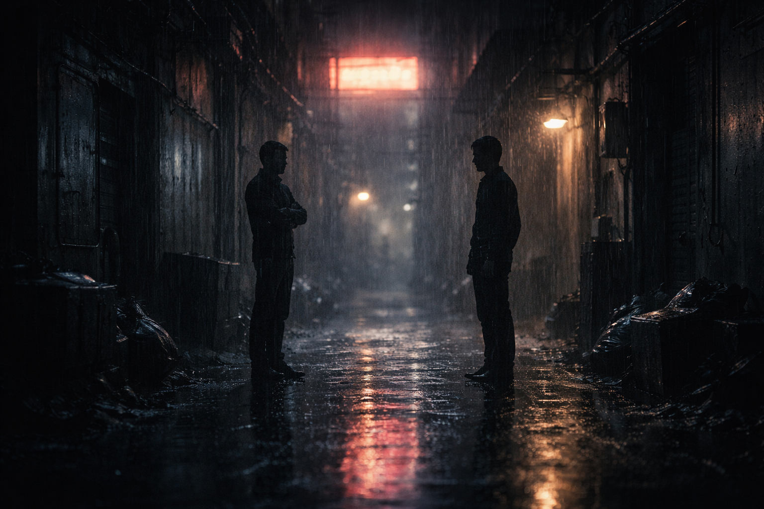 Rain on both of them now. The alley narrow and dark and the kind of quiet that makes words heavier than they should be.